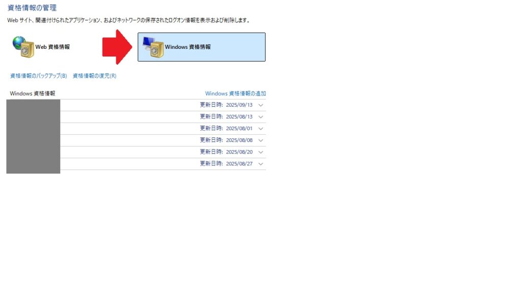 資格情報マネージャーを開いて、WINDOWS資格情報をクリック。
