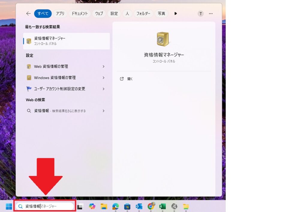 PC中央の検索バーに『資格情報マネージャー』と入力。