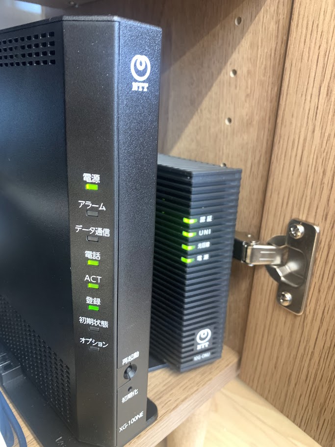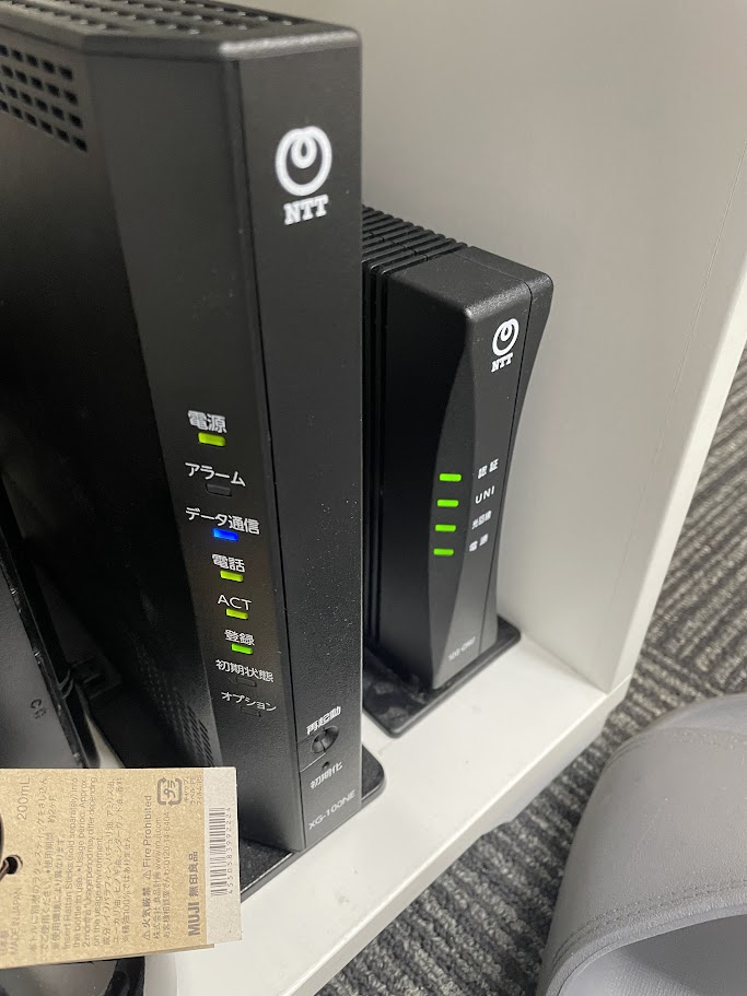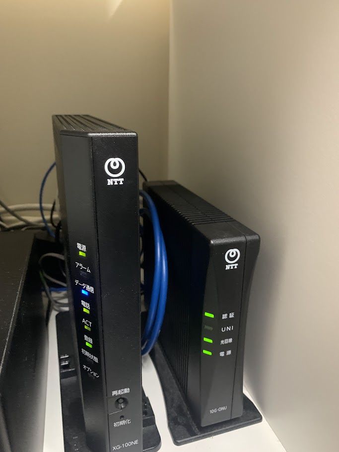 こちらの拠点はルーターレンタルなし、電話契約なしでスタートしたので、奥にある端末10G-ONUとWXR-5700AX7を直接つないでルーターモードで使用していました。