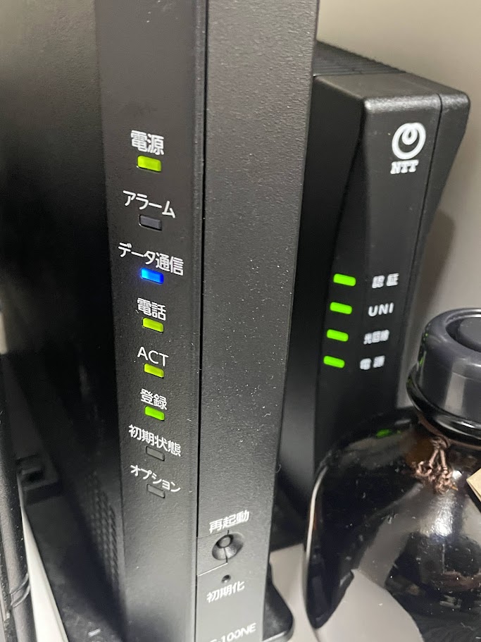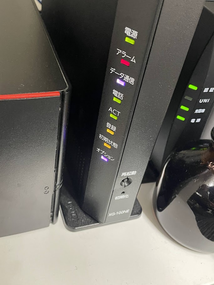 光電話を追加契約したため、XG100-NGが後から発送されて、工事なしでの作業となったのですが、以下写真を見ていただくと、上から3つ目のアラーム下の【データ通信】のランプが消灯しています。